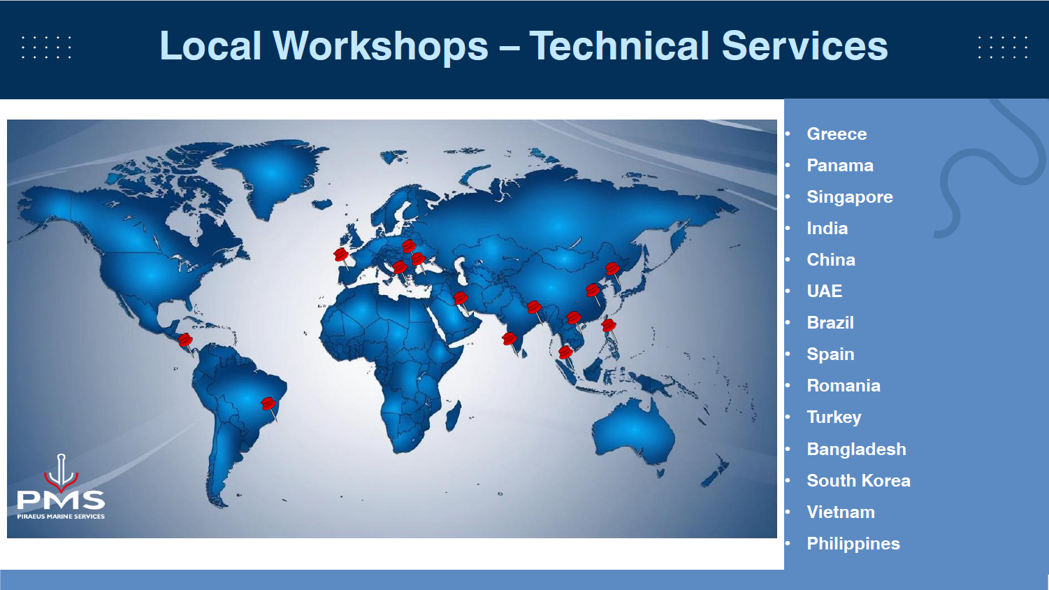 Wherever your vessel operates, PMS S.A. ensures fast, efficient, and high-quality technical services at key ports worldwide. Our trusted network of local workshops and experienced technicians is ready to provide everything from emergency repairs to scheduled maintenance, minimizing downtime and keeping your operations smooth and efficient.
